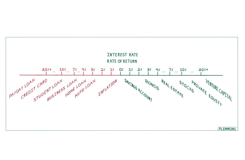 The graphic above shows common interest rates and expected rates of return for different loans and asset classes, at the time of this writing (these things change over time). I made it because people generally think about one thing at a time or the left side or the right side, but rarely zoom out to see the full continuum.