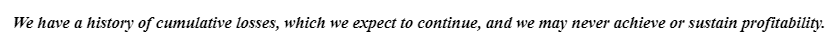 The criticism would obviously have nothing to do with their products, which we mostly like. It would be directed at their dependency on shareholders’ belief in their narrative of the future, and how they became more valuable as they lost billions of dollars.