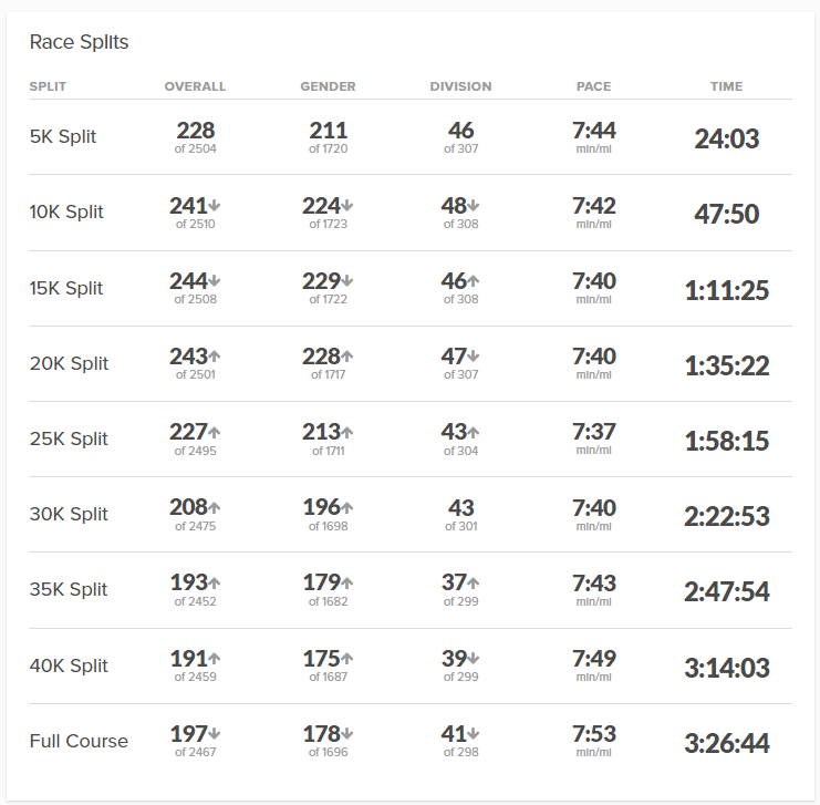 I was having to coach myself, “As long as you don’t mess anything up, you are going to beat that. And it’s gonna be okay.” I knew it was going be in the high 7:40s low 7:50s. I said, “Just be okay with that.” I was pleased with that. There was no real difference (to me) between 3:20 and 3:26.