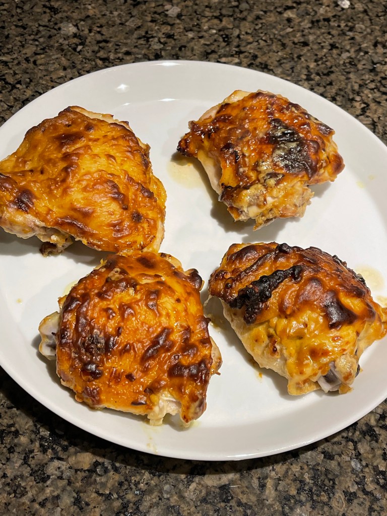 - Chicken (2 lbs of chicken thighs – bones in, skin on)