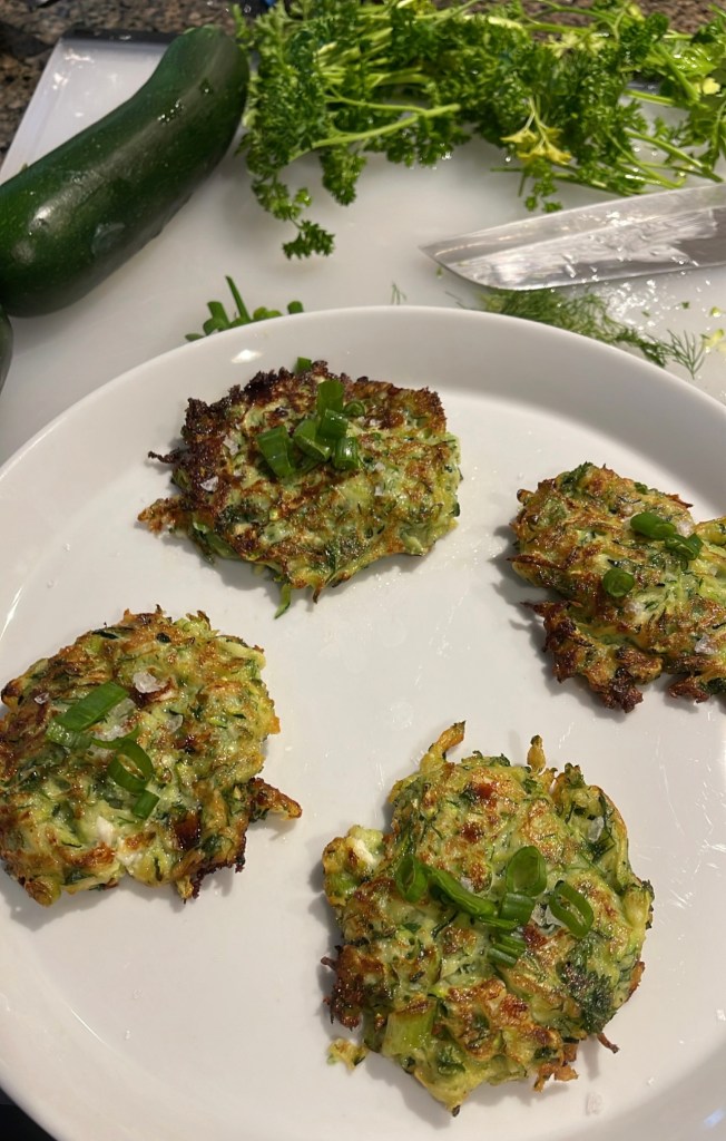 - Working in batches, drop 1/4 cups at a time of the zucchini mixture into the pan, leaving about 2 inches between each fritter. Fry golden and crisp, 1.5-2 minutes per side.