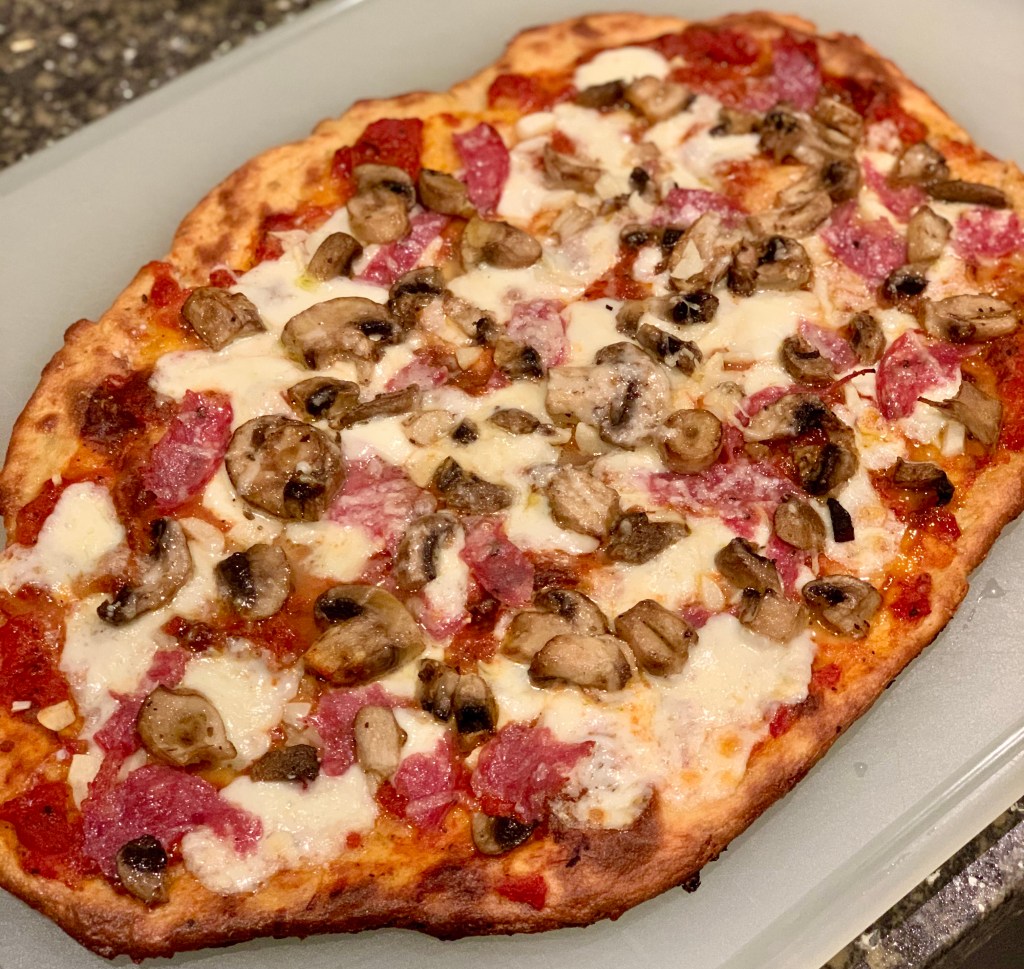 - Remove the top parchment paper and slide dough onto a baking sheet or pizza stone. Bake at 475° in the oven for 5-8 minutes until slightly browned.