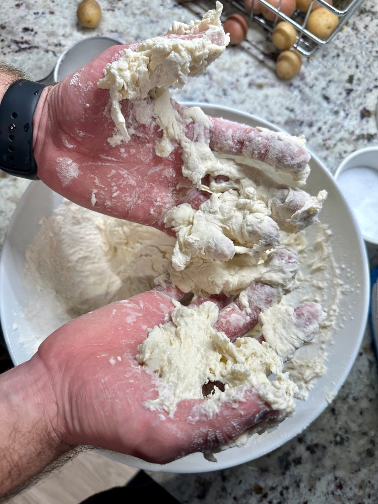- You will intuitively know by the texture whether it needs a little more water or flour. You want a “shaggy” dough.
