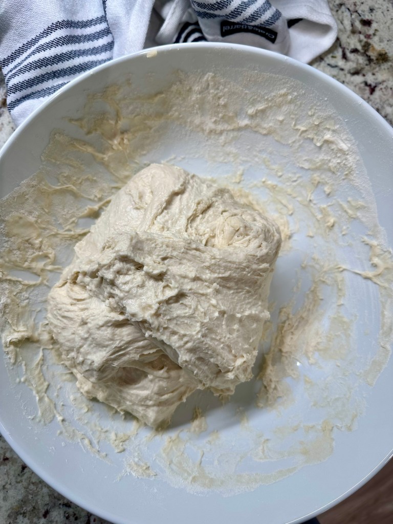 - After the dough has sat for 30 minutes, you do NOT mix or knead the dough anymore. This can “overwork” the dough. Instead, you fold it.