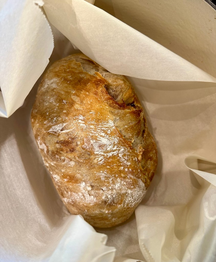 - Place the loaf on parchment paper, insert into the Dutch Oven, & cover with lid.