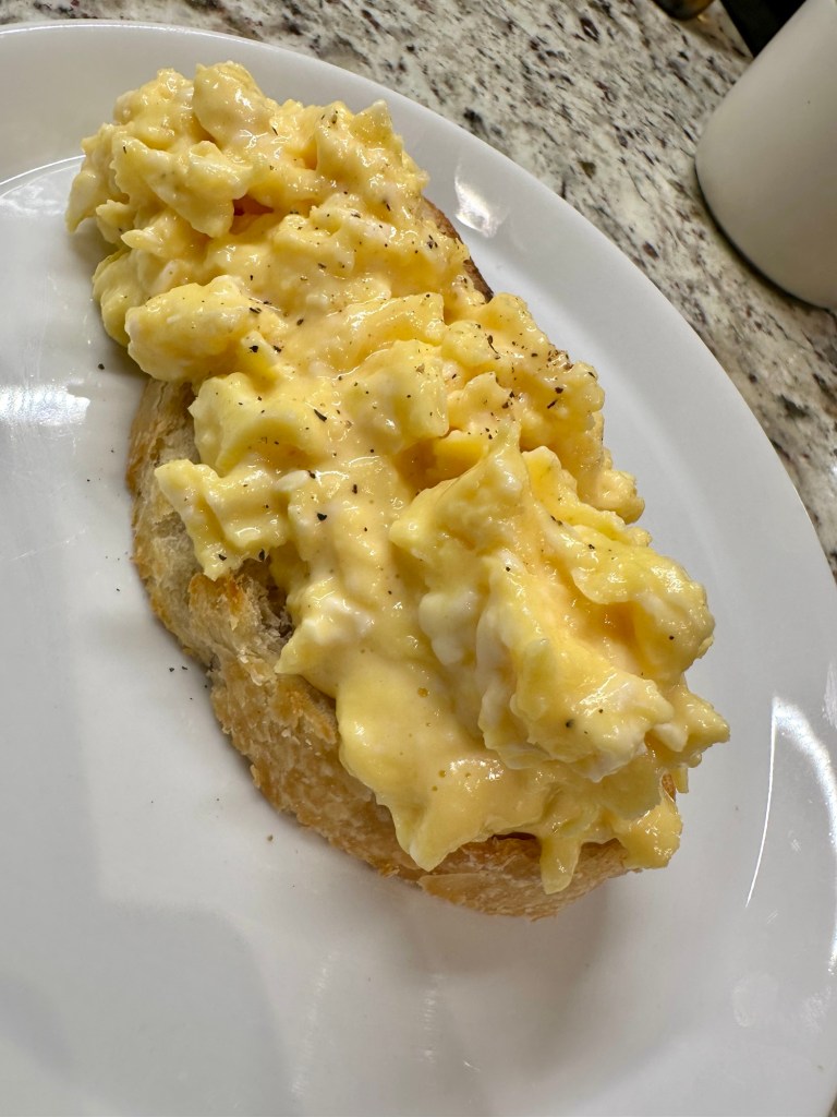 - Put the softly scrambled eggs on top of the toast and serve immediately.