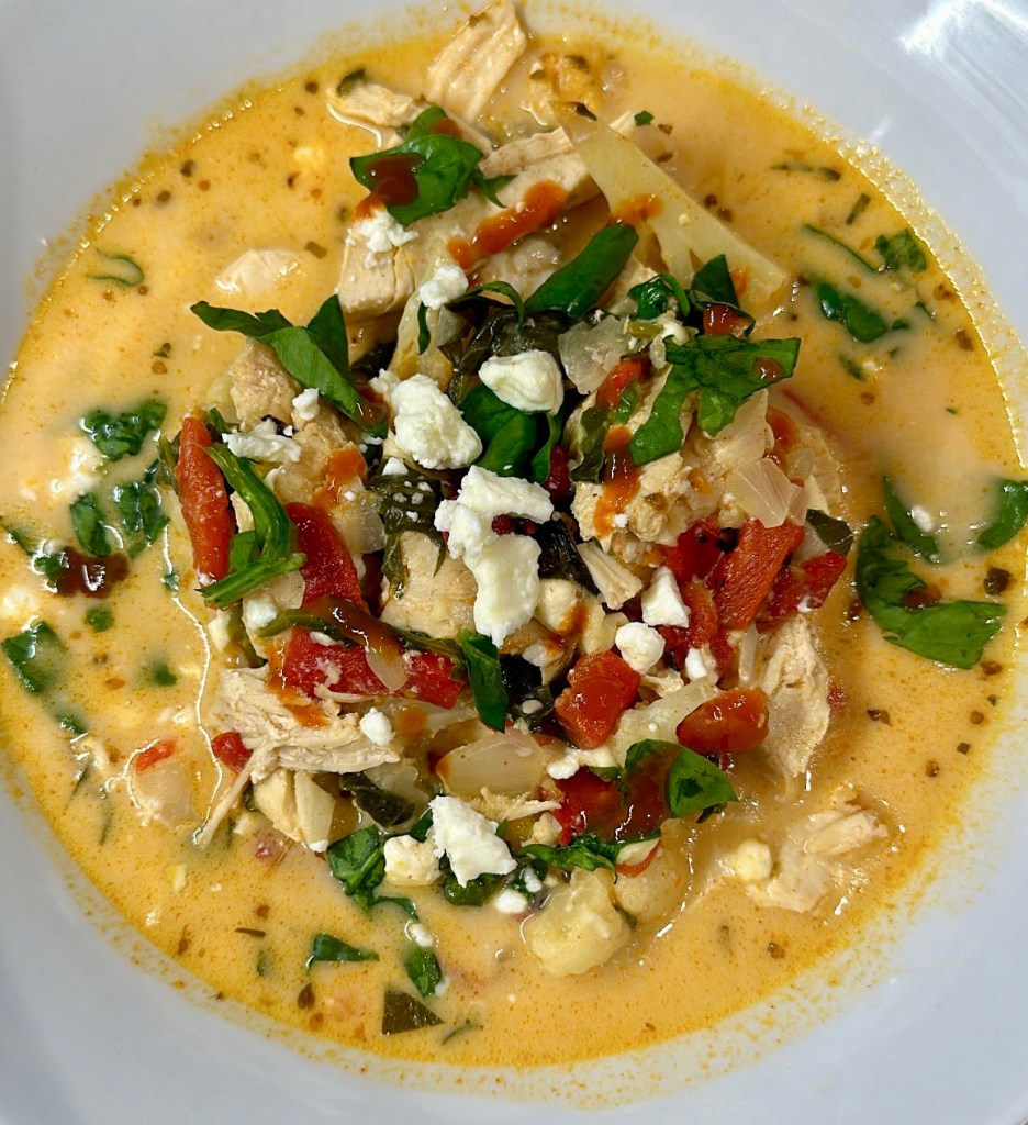 - Add spinach, crumbled feta, cream cheese, and lemon juice. Put the chicken back in the pot.