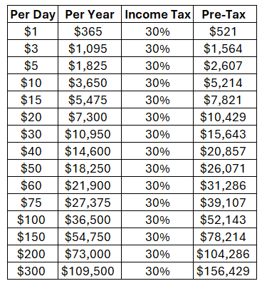 Let’s assume that you pay 30% in taxes on the money you make. To spend $20 more a day ($7,300 per year), you need to make $10,429 more per year before taxes.
