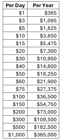 A year ago, a rich friend said he had the realization that spending fifty extra dollars a day is about $20,000 a year ($18,250).