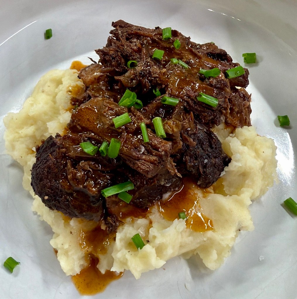 - Serve: Spoon mashed potatoes onto plates, top with sliced or shredded chuck roast, and ladle sauce over everything. Garnish with chives.