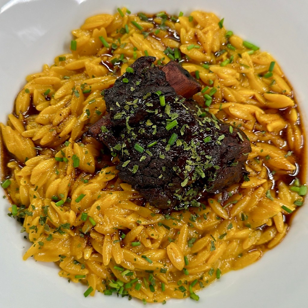 - Serve: Spoon saffron orzo into bowls, top with short ribs, and finish with braising sauce. Garnish with chives.