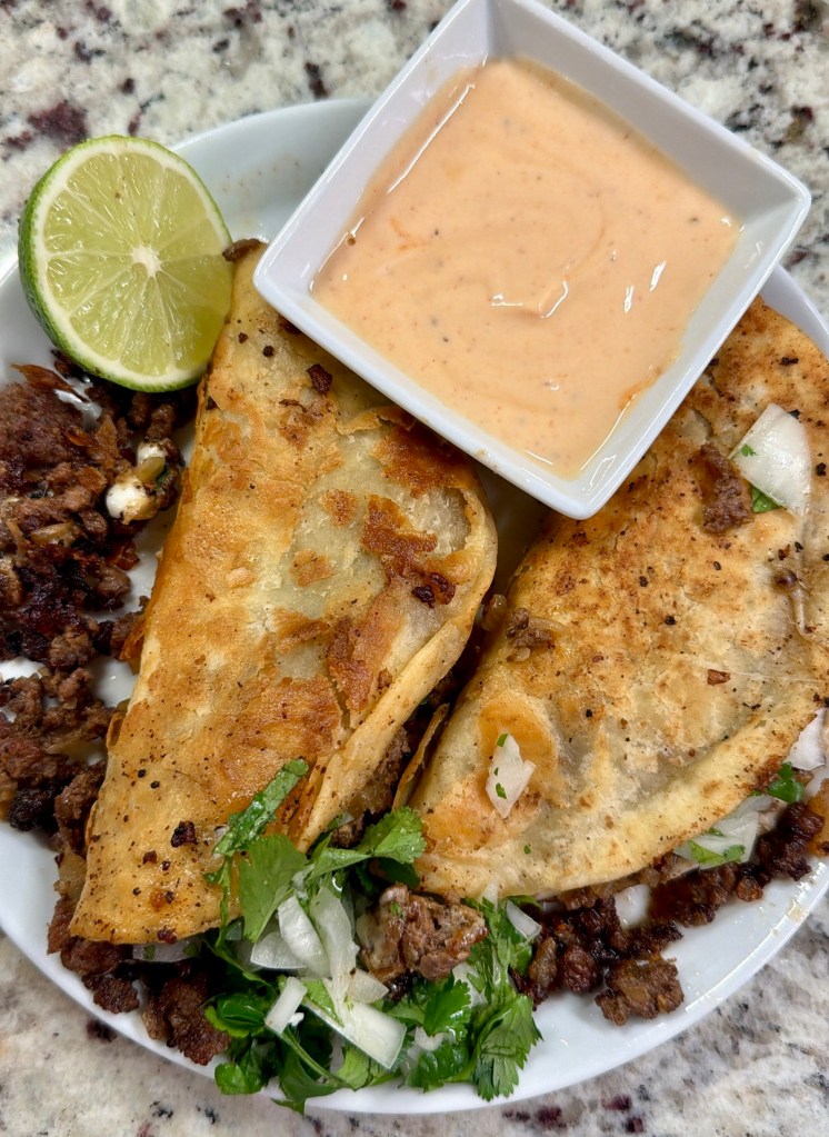 Top with raw onion, cilantro, and drizzle with Greek yogurt crema.