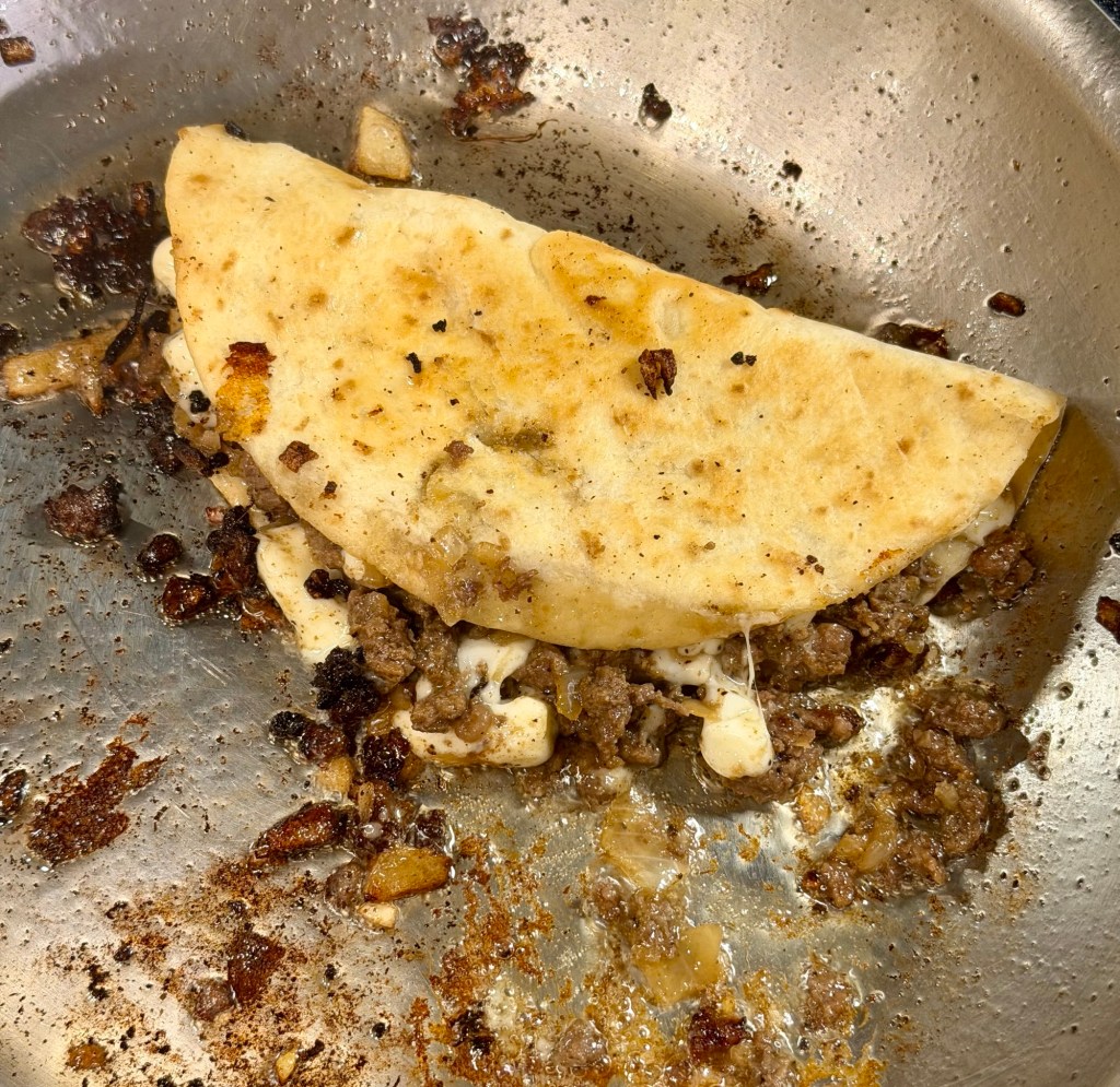 Spoon cooked venison mixture onto one half. Once cheese melts and begins to crisp, fold in half. - Crisp & Flip